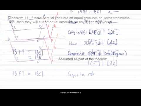 Theorem 11. If 3 parallel lines cut off equal segments on some transversal line, then they cut off equal segments on any other transversal.